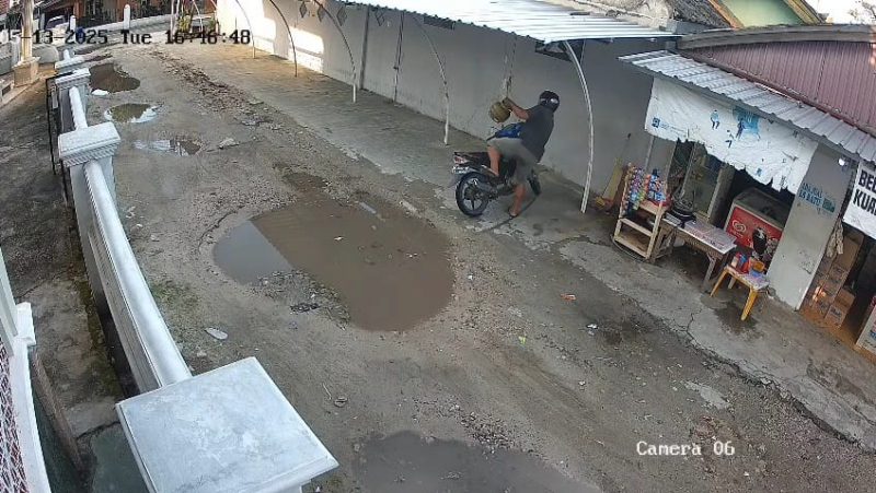 Dalam rekaman CCTV yang diperoleh, terlihat seorang pria mengenakan kaos dan celana pendek datang ke warung tersebut dengan berpura-pura membeli minuman. Pria yang masih mengenakan helm itu kemudian keluar sambil meminum air kemasan, lalu menuju sepeda motornya yang terparkir di depan warung.