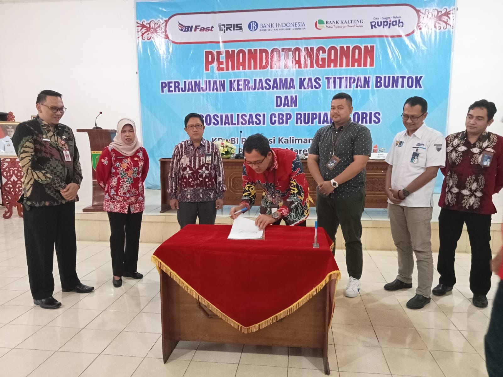 Pimpinan PT Bank Kalteng Cabang Buntok menandatangani perjanjian kerjasama kas titipan dengan Bank Indonesia, dirangkai dengan kegiatan sosialisasi Cinta, Bangga dan Paham (CBP) Rupiah serta QRIS. Foto : Rul