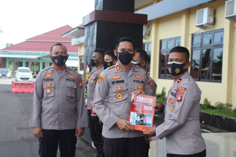 Kapolres Seruyan AKBP Bayu Wicaksono, S.H., S.I.K., M.Si., membagikan tabloid Polres Seruyan kepada para Kapolsek Jajaran Polres Seruyan di halaman Mapolres Seruyan. Foto : TN