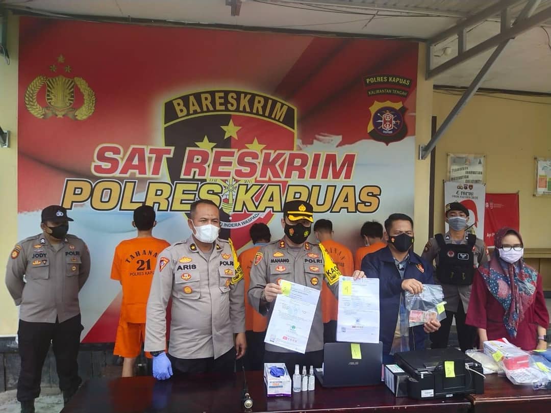 Kapolres Kapuas AKBP Manang Soebeti, S.I.K., M.Si., menggelar konferensi pers terkait pengungkapan kasus surat rapidtes antigen palsu, Jumat (7/5/2021) siang.