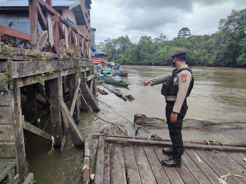 KUALA PEMBUANG, BorneoDaily.co.id – Personel Polsek Seruyan Hulu cek ketinggian debit air Sungai Seruyan.