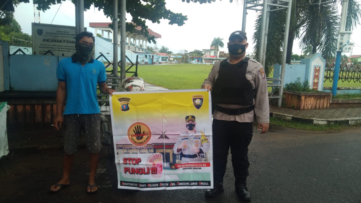 KUALA PEMBUANG, BorneoDaily.co.id — Kapolres Seruyan AKBP Bayu Wicaksono, S.H., S.I.K., M.Si., melalui Kasat Binmas AKP Wawan Aryana Menjelaskan personel Satuan Pembinaan Masyarakat yaitu (Sat Binmas) melaksanakan Seruyan Sapa Masyarakat (SerPaGamas) dan berikan sosialisasi Sapu Bersih Pungutan Liar (Saberpungli) kepada Masyarakat di Jl.M.T.Haryono, Kel.Kuala Pembuang I Kec.Seruyan Hilir Kab.Seruyan, Sabtu (22/5/2021).