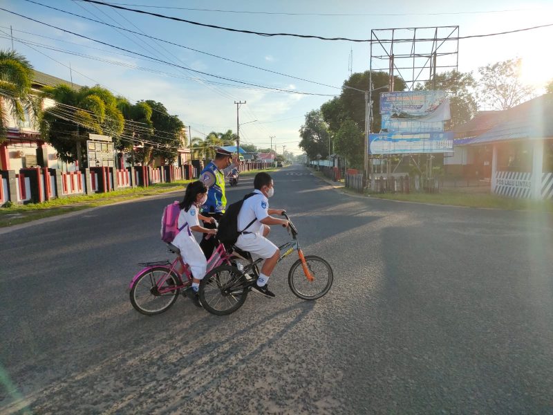 Anggota Satuan Lalu Lintas (Sat Lantas) Polres Seruyan melakukan pengaturan arus lalu lintas sekaligus membantu menyeberangkan anak-anak sekolah yang akan berangkat ke Sekolah untuk mengikuti proses belajar mengajar, Rabu (08/06/2022) pagi.
