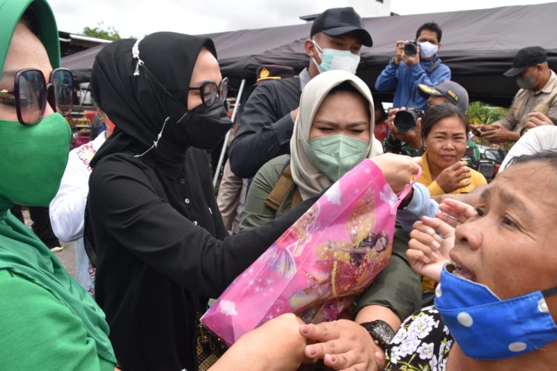 TEKS FOTO : Ketua TP-PKK Prov. Kalteng Ivo Sugianto Sabran saat membagikan bantuan untuk masyarakat terdampak banjir di Kabupaten Katingan khususnya perempuan dan anak, Sabtu (11/9/2021). Foto : TN